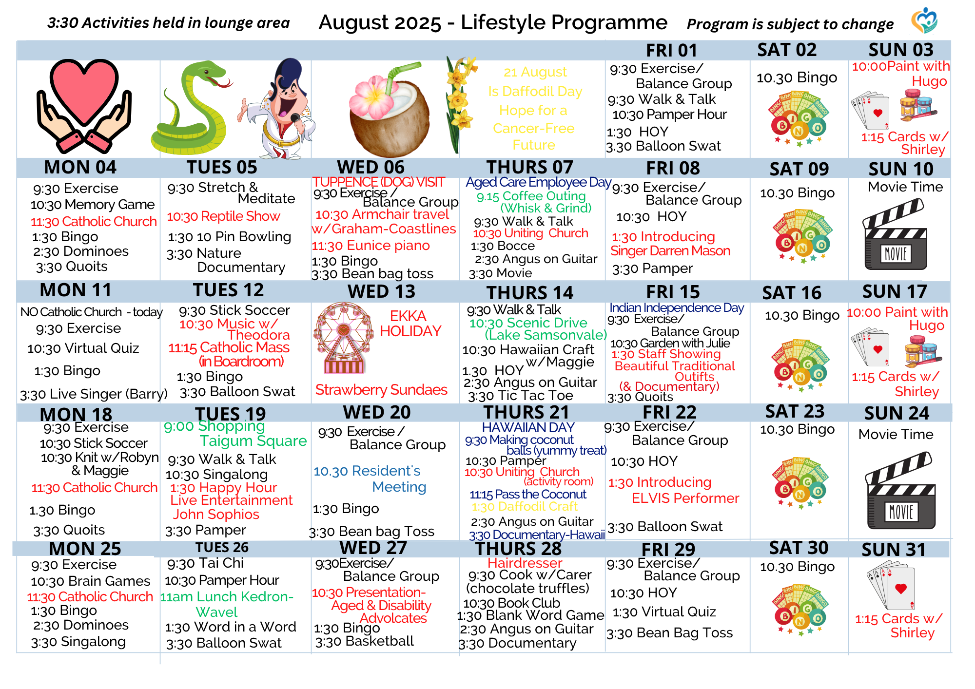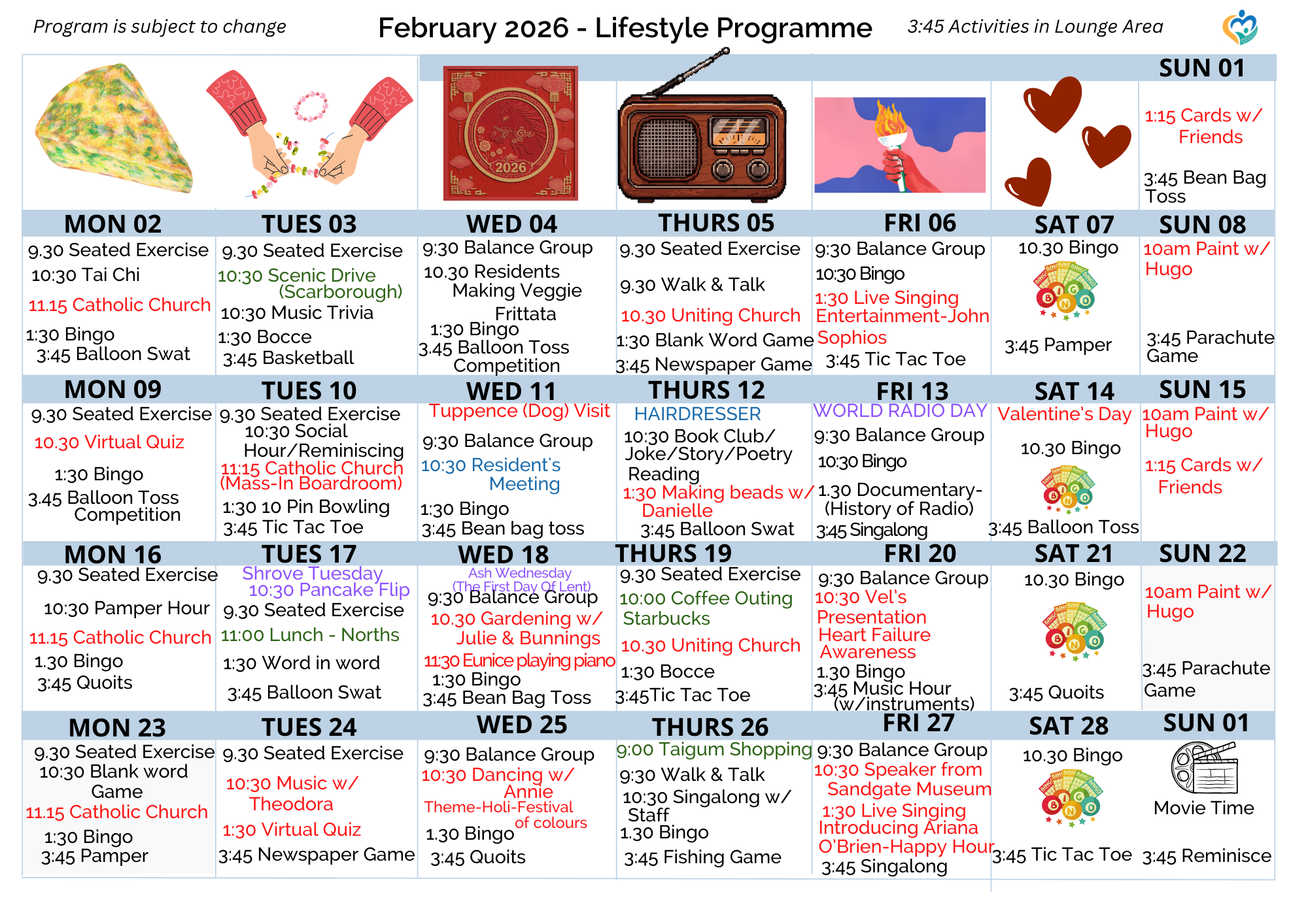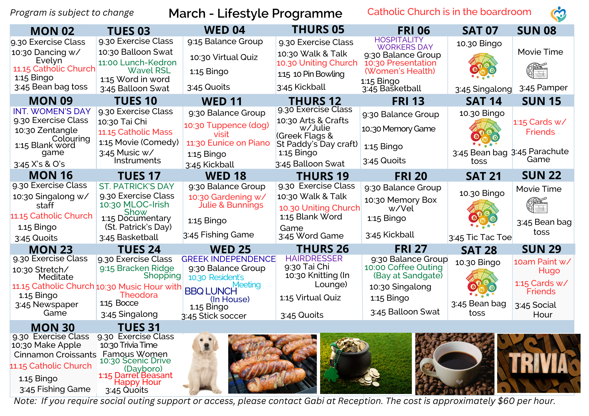 We encourage family, friends and community groups to join us whenever they can. Our Activities Calendar is published here each month for easy reference.